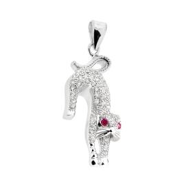 Ciondolo a forma di giraffa con applicazione smalto colore rosa.