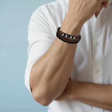 Bracciale multifilo in ecopelle colore marrone, fascia intrecciata, con accessori palline nere e accessori centrali neri e in acci...