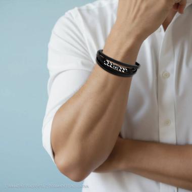 Bracciale multifilo in ecopelle colore nero, fasce intrecciate, con accessori centrale cilindrici con decoro con lavorazione laser...
