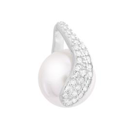 Ciondolo a forma di vortice con cubic zirconia incastonati con montatura pavè e al centro perla in vetro perlato bianco.