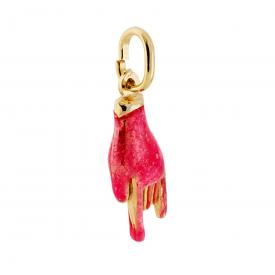 Ciondolo a forma di mano a corna con applicazione smalto colore rosso perlato e brillante.