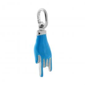 Ciondolo a forma di Mano con Corna portafortuna con applicazione smalto colore azzurro con finitura liscia e lucida.