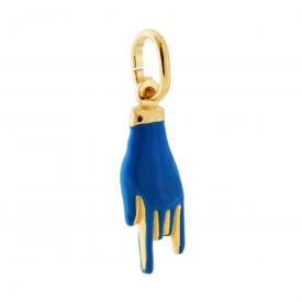 Ciondolo a forma di mano a corna con applicazione smalto colore azzurro perlato e brillante.