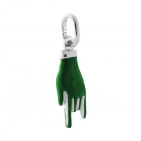 Ciondolo a forma di Mano con Corna portafortuna con applicazione smalto colore verde con superficie glitterata.