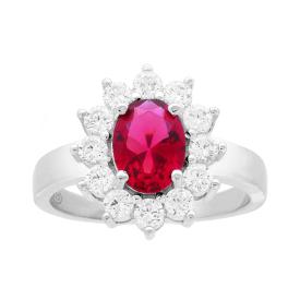 Anello Solitario con Zircone centrale Ovale Rosso Rubino su montatura 4 Griffe contornato da Zirconi Bianchi.