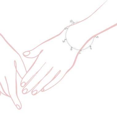 Bracciale con catena forzatina liscia e lucida con accessori pendenti a forma di Farfalla e Fiori, piatti, lisci e lucidi.