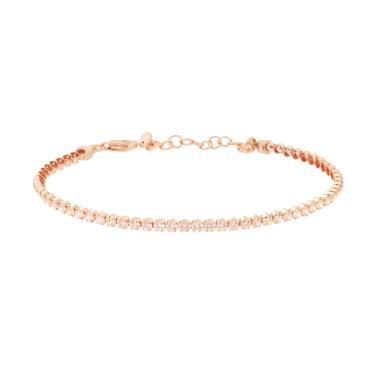 Bracciale Tennis con cubic zirconia rosa montati su 4 Griffe, con accessorio piastrina di forma tonda liscia e lucida.