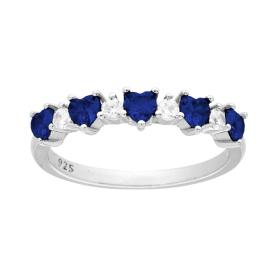 Anello veretta con cubic zirconia Blu Zaffiro a forma di cuore montato su 3 Griffe e cubic zirconia bianchi incastonati ai lati.
