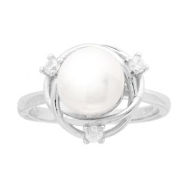 Anello con cerchio liscio e lucido con cubic zirconia bianco e perla bianca naturale di fiume in centro.