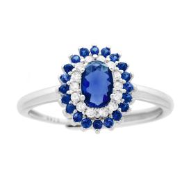 Anello con montatura rettangolare con zircone centrale colore Blu Zaffiro e zirconi bianchi incastonati intorno.