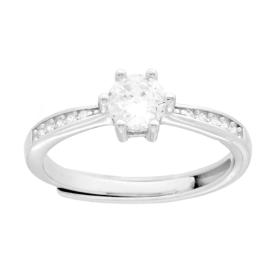 Anello Solitario con Cubic Zirconia colore Bianco con montatura Griffe. Gambo laterale con cubic zirconia bianchi incastonati.