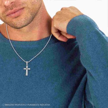 Collana con catena forzatina diamantata con accessorio pendente a forma di croce con Gesù Cristo in rilievo, finitura liscia e lu...