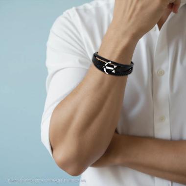 Bracciale multifilo in ecopelle colore nero, fasce intrecciate, con accessorio centrale annodato a forma di ancora con finitura li...
