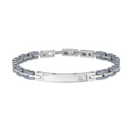 Bracciale con maglia imperniata bicolore, ceramica antracite e acciaio, con accessorio targa con finitura lucida e satinata.