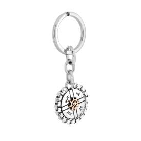 Portachiavi ad anello con accessorio pendente tondo con soggetto centrale a forma di rosa dei venti con finitura lucida e brunita....