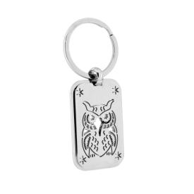 Portachiavi ad anello con accessorio pendente a forma di piastra con cornice decorativa e con finitura satinata e lucida.