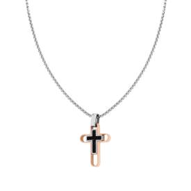 Collana con catena Veneziana tonda con accessorio pendente a forma di croce bicolore, acciaio e nero con dettagli rosè e finitura...