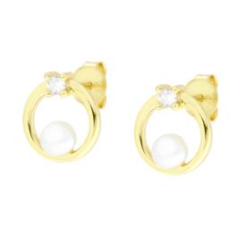 Ciondolo a forma di vortice con cubic zirconia incastonati con montatura pavè e al centro perla in vetro perlato bianco.