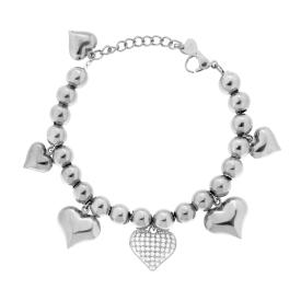 Bracciale con catena di palline lucide e accessori pendenti a forma di cuore bombato con finitura lucida e con crystal bianchi inc...