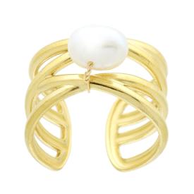 Anello composto da doppio gambo pallinato con finitura liscia e lucida e perla bianca su base piatta e irregolare.