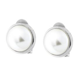 Orecchini semisfera con chiusura a clip e perla bianca in vetro perlato.