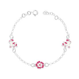 Bracciale con catena rolò con targa ovale liscia e lucida e accessorio a forma di testa di orsetto con applicazione smalto rosa.<...