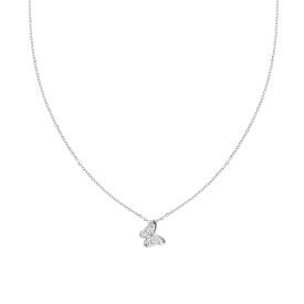 Collana con catena forzatina con accessorio a forma di farfalla con crystal bianchi incastonati e perle bianche.