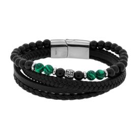 Bracciale multifilo in ecopelle colore nero, fasce intrecciate, con accessori centrale cilindrici con decoro con lavorazione laser...
