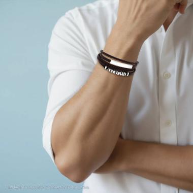 Bracciale multifilo in ecopelle colore marrone, fascia intrecciata, con accessori targhe, satinata e con lavorazione decorativa e ...