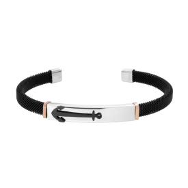 Bracciale semirigido composto da tre fili fune di acciaio bicolore con accessorio centrale targa nera con finitura liscia e lucida...