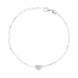 Bracciale con catena di palline diamantate e filo di perle bianche in vetro perlato con accessorio centrale a forma di cuore e pun...