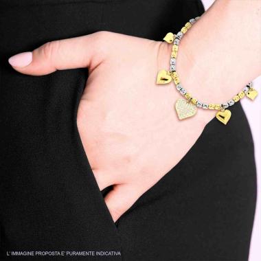 Bracciale con catena di ovali bicolore con finitura martellata e accessori pendenti a forma di cuore bombato con finitura lucida e...