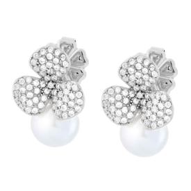 Orecchini con semicerchio al lobo con crystal bianchi incastonati e perla bianca.