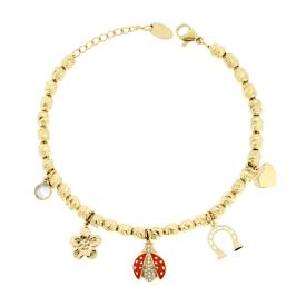 Bracciale con catena di ovali bicolore con finitura martellata e accessori pendenti a forma di cuore corno e coccinella con smalto...