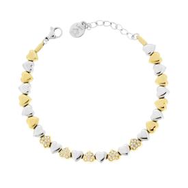 Bracciale con catena forzatina diamantata alternata a cuori plain in linea con crystal bianchi incastonati e con finitura lucida.