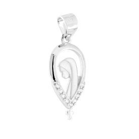 Ciondolo a forma di cuore con cubic zirconia bianchi incastonati con all'interno sagoma della Madonna con finitura lucida e laser.