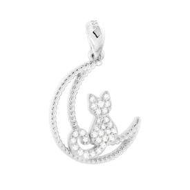 Ciondolo a forma di luna con finitura pallinata e gatto con cubic zirconia bianchi incastonati.