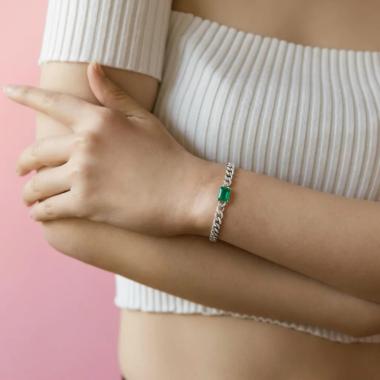 Bracciale con catena grumetta con finitura lucida e con cubic zirconia bianchi incastonati, accessorio centrale pietra naturale re...