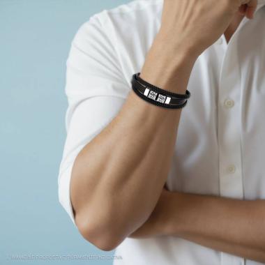 Bracciale multifilo in ecopelle colore nero, fasce intrecciate, con accessori centrale cilindrici con decoro con lavorazione laser...