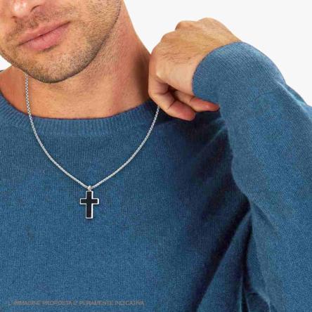 Collana con catena Veneziana Tonda con accessorio pendente a forma di croce con inserto nero con effetto fibra di carbonio.