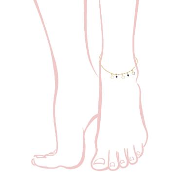 Cavigliera con catena grumetta con perlina colore blu e accessori pendenti a forma di stella, con finitura liscia e lucida.