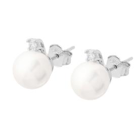 Ciondolo a forma di vortice con cubic zirconia incastonati con montatura pavè e al centro perla in vetro perlato bianco.