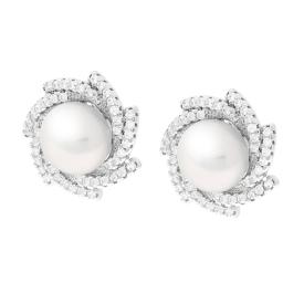 Ciondolo a forma di vortice con cubic zirconia incastonati con montatura pavè e al centro perla in vetro perlato bianco.