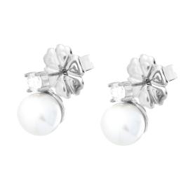 Orecchini con punto luce crystal bianco montato su Griffe e perla bianca, chiusura con farfallina decorativa a forma di fiore.