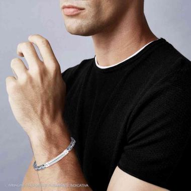 Bracciale per uomo con maglia colore nero e acciaio con finitura lucida, con accessorio targa colore nero con finitura liscia e sa...