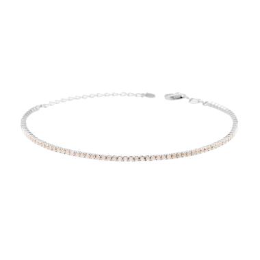 Bracciale Tennis con cubic zirconia rosa montati su 4 Griffe, con accessorio piastrina di forma tonda liscia e lucida.